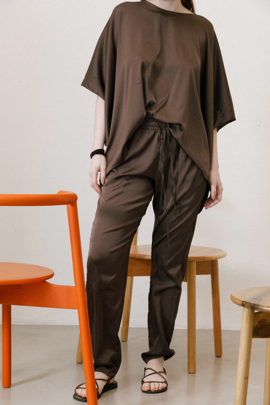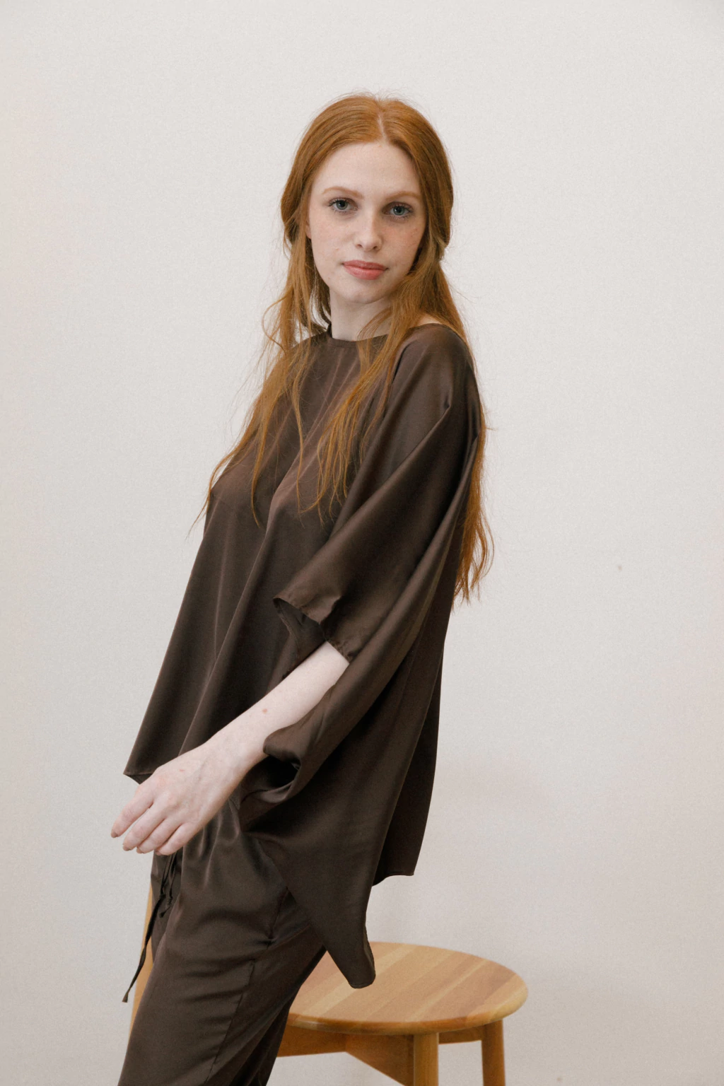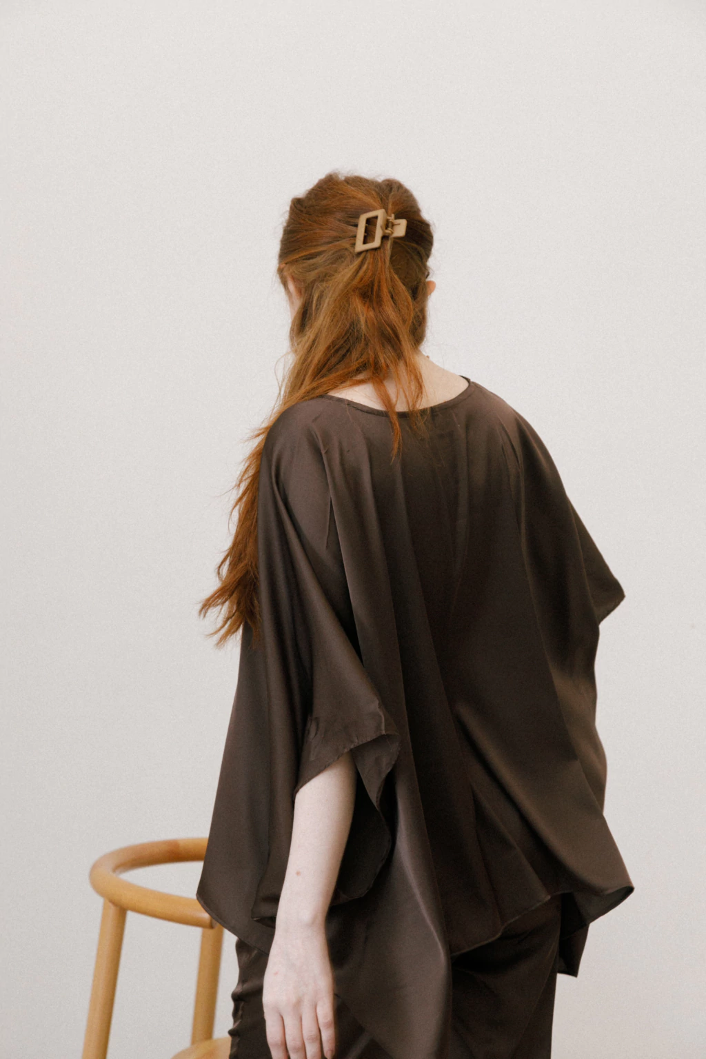 La blusa se presenta amplia y generosa, con vuelo y un corte pensado para que la tela no sea un limitante, si no todo lo contrario, se mueva como capa ligera.
